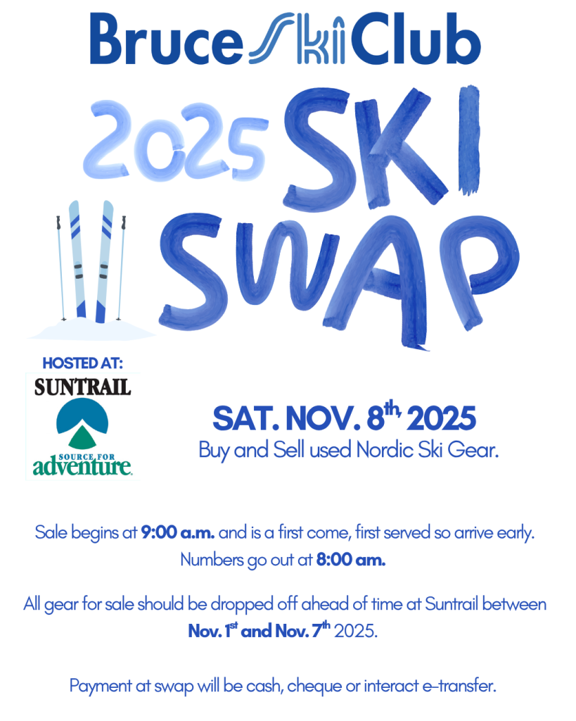 - Cross-Country Ski Swap – TBD: If you are in need of used ski equipment, the Ski Swap is a great place to find it. Held at Suntrail Source for Adventure in Hepworth, Ontario.