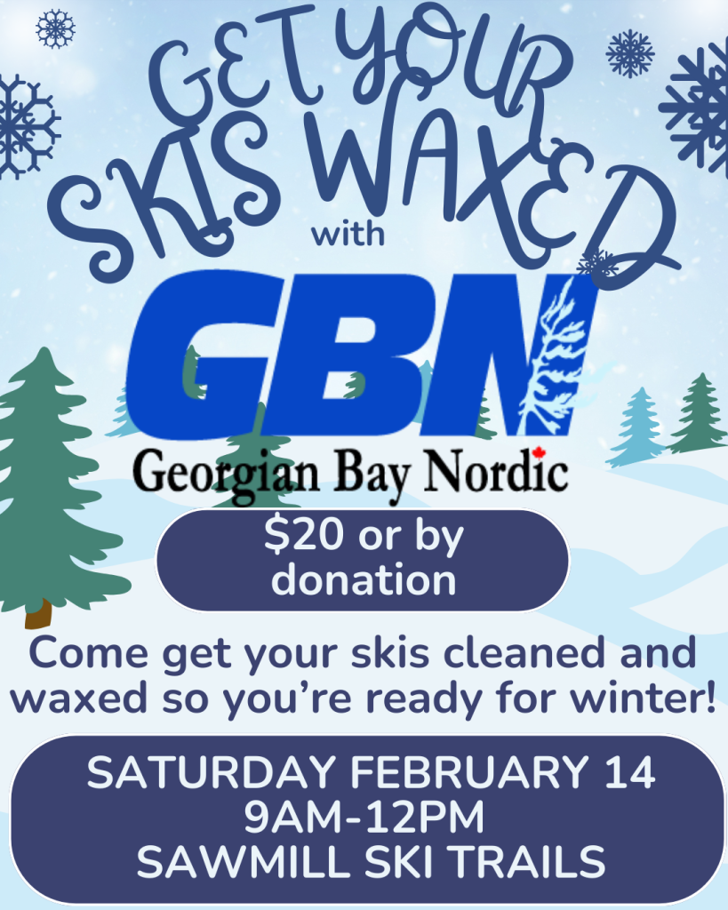 - Love Your Skis Day – TBD, Parking lot of Suntrail Source for Adventure in Hepworth, Ontario: Get your skis cleaned and waxed by members of Georgian Bay Nordic. All proceeds benefits GBN’s ski program.